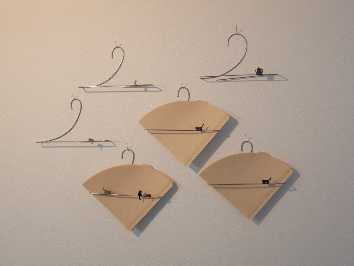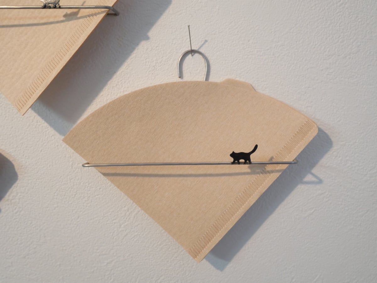 コーヒーフィルターラック 幅14㎝、画びょう、釘などでとめるラックです。 参考フィルター ハリオv60用フィルター02(1~4人用) 小さめの1~2杯用のフィルターだと落ちてしまいます。 種類 黒猫A(しっぽが高め) 黒猫B(Aよりはちょっと低い) コーヒーポット黒 白猫 白いうさぎ
